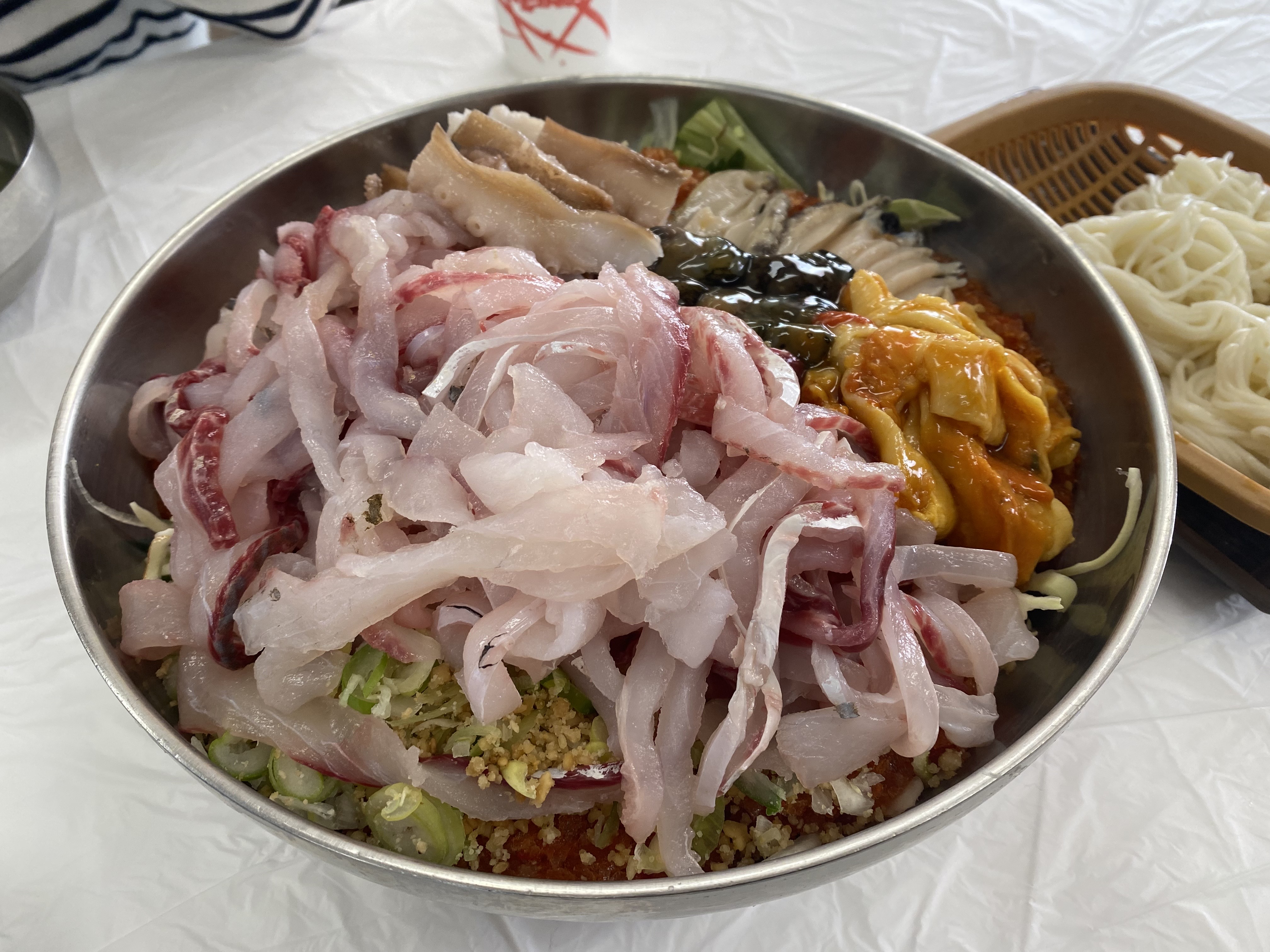 둘이서 방문해서 2인분 정도의 양이라고 적혀있는 '황제물회'를 주문했다. 2인분이라고 적혀있지만, 실제 양은 3~4인분이다. 소면도 4개나 주셔서 정말 배부르게 먹었다. 위가 작은 분들이라면 선녀물회 1개를 주문하고 해물파전을 주문하는 것을 추천한다.