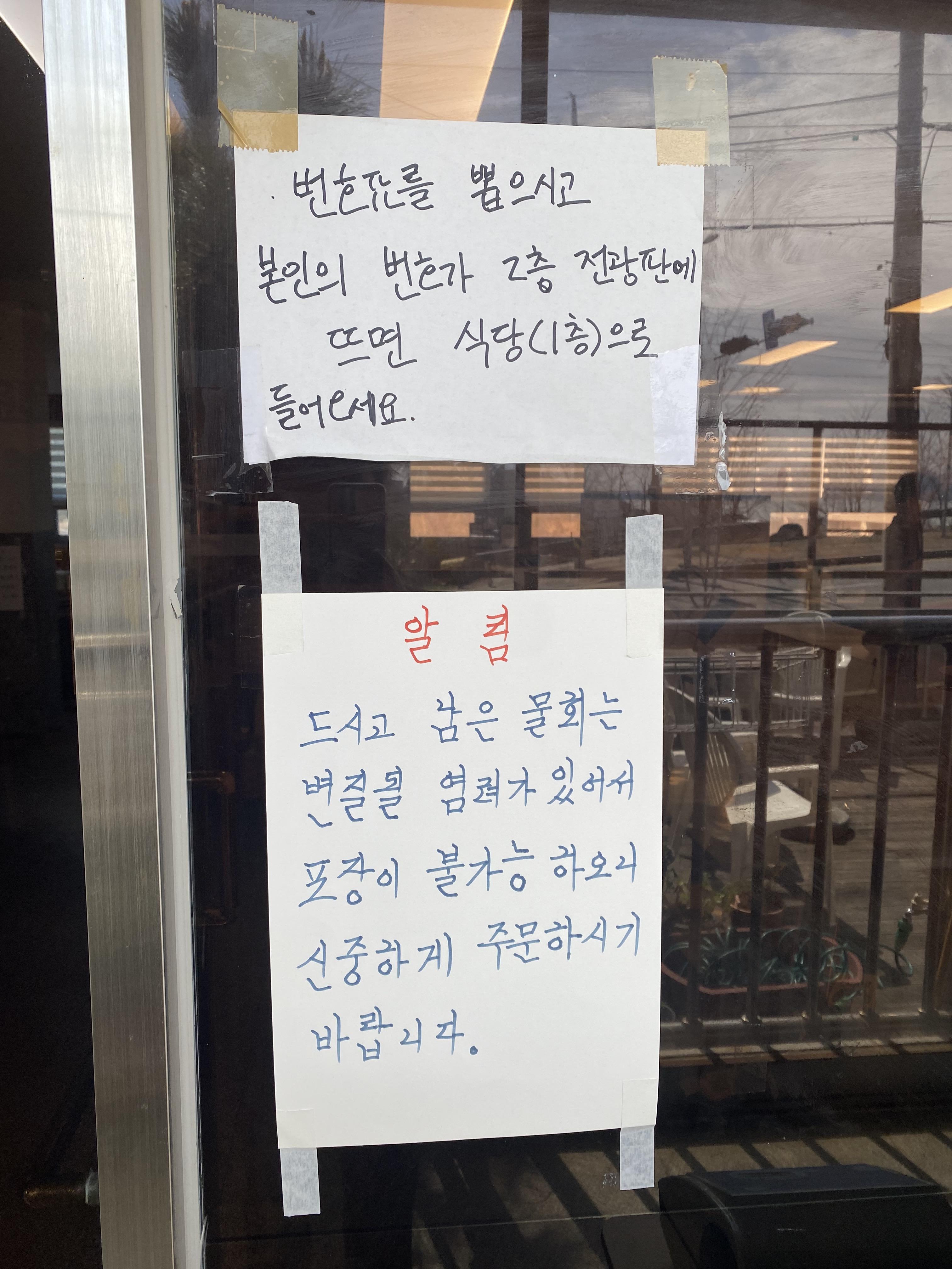 식당 앞에는 웨이팅에 대한 설명과, 남은 음식 포장이 불가능 하다는 안내가 붙어있었다.